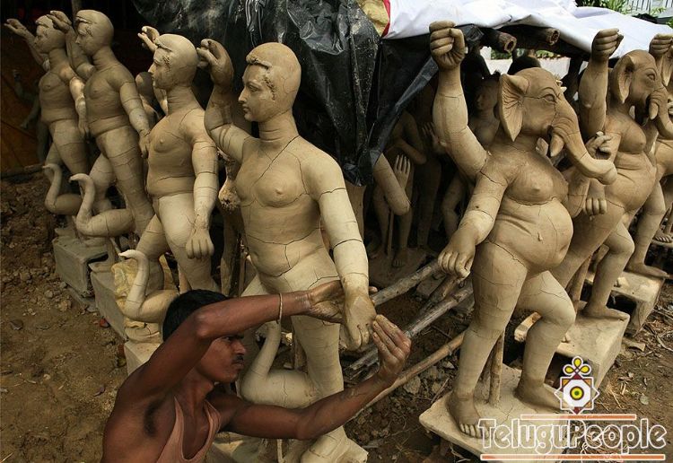 An artist works on an idol of Hindu goddess Durga for the forthcoming Durga Puja festival in Allahabad, India, Tuesday, Sept. 1, 2009.