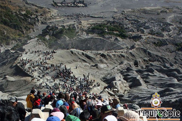 Thousands of Tenggerese tribespeople climb up the holy Mount Bromo in Probolinggo, East Java, on September 6, 2009, during the Hindu Yadnya Kasada festival. During the annual Yadnya Kasada festival the Tenggerese climb Mount Bromo, an active volcano, and seek the blessing from the main deity Hyang Widi Wasa by presenting offerings of rice, fruit, livestock and other local produce.